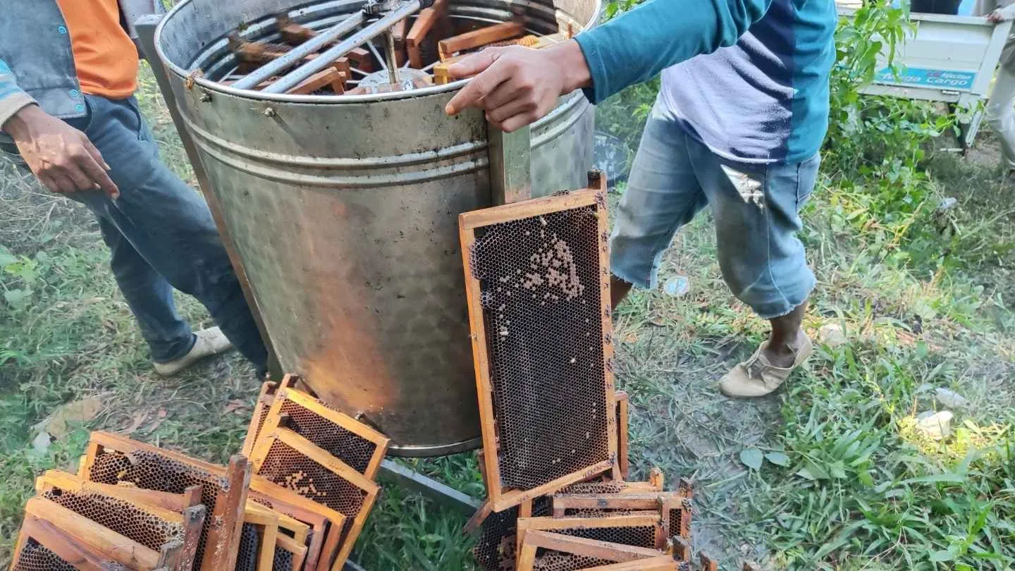 Proses panen dilakukan secara alami tanpa campuran bahan tambahan, menjaga kemurnian madu mentah langsung dari sarang.